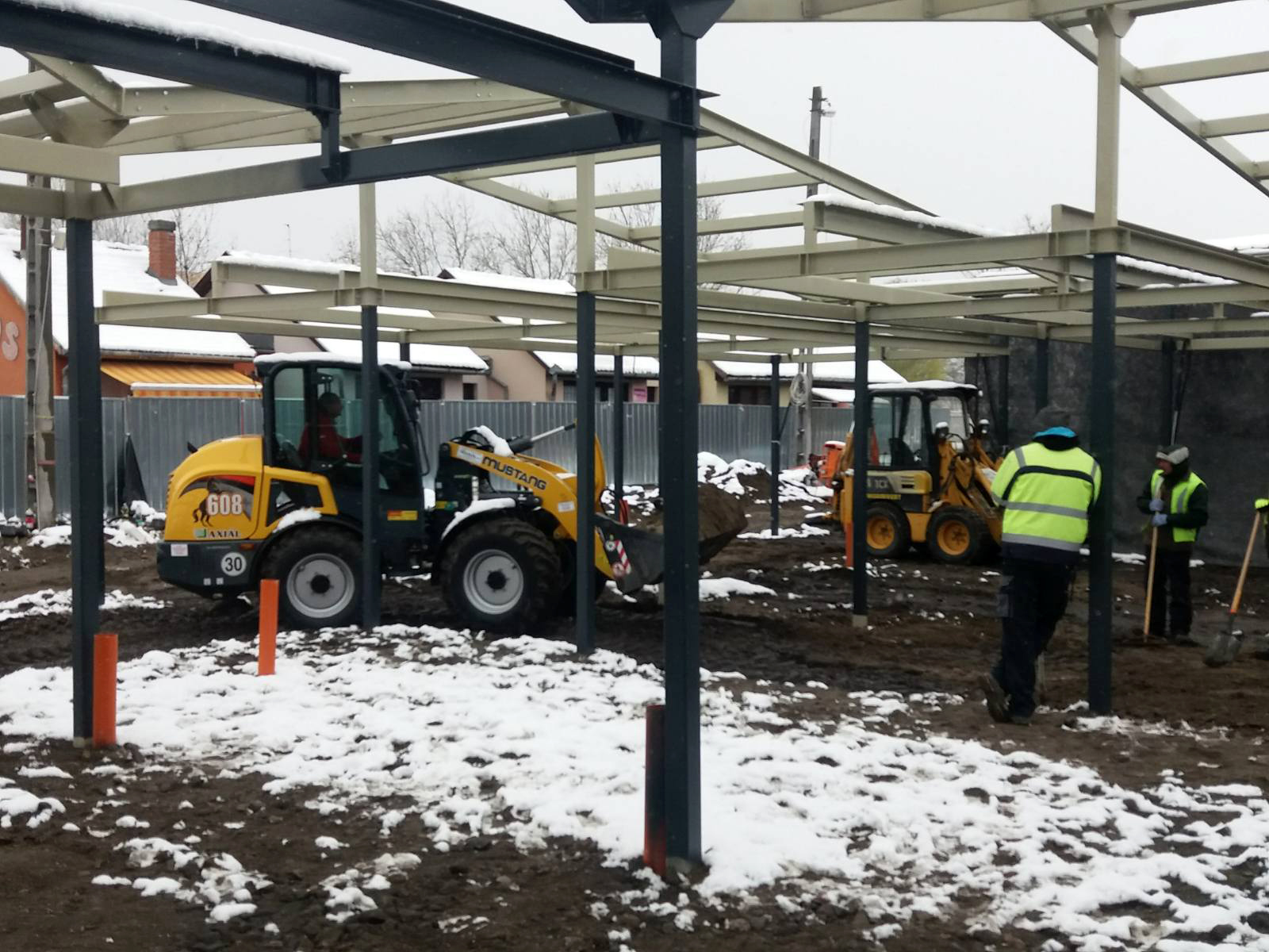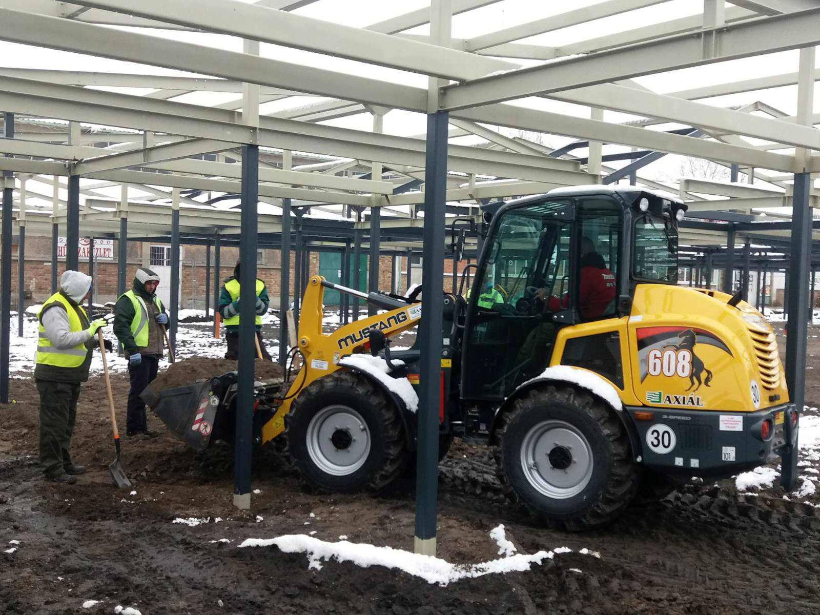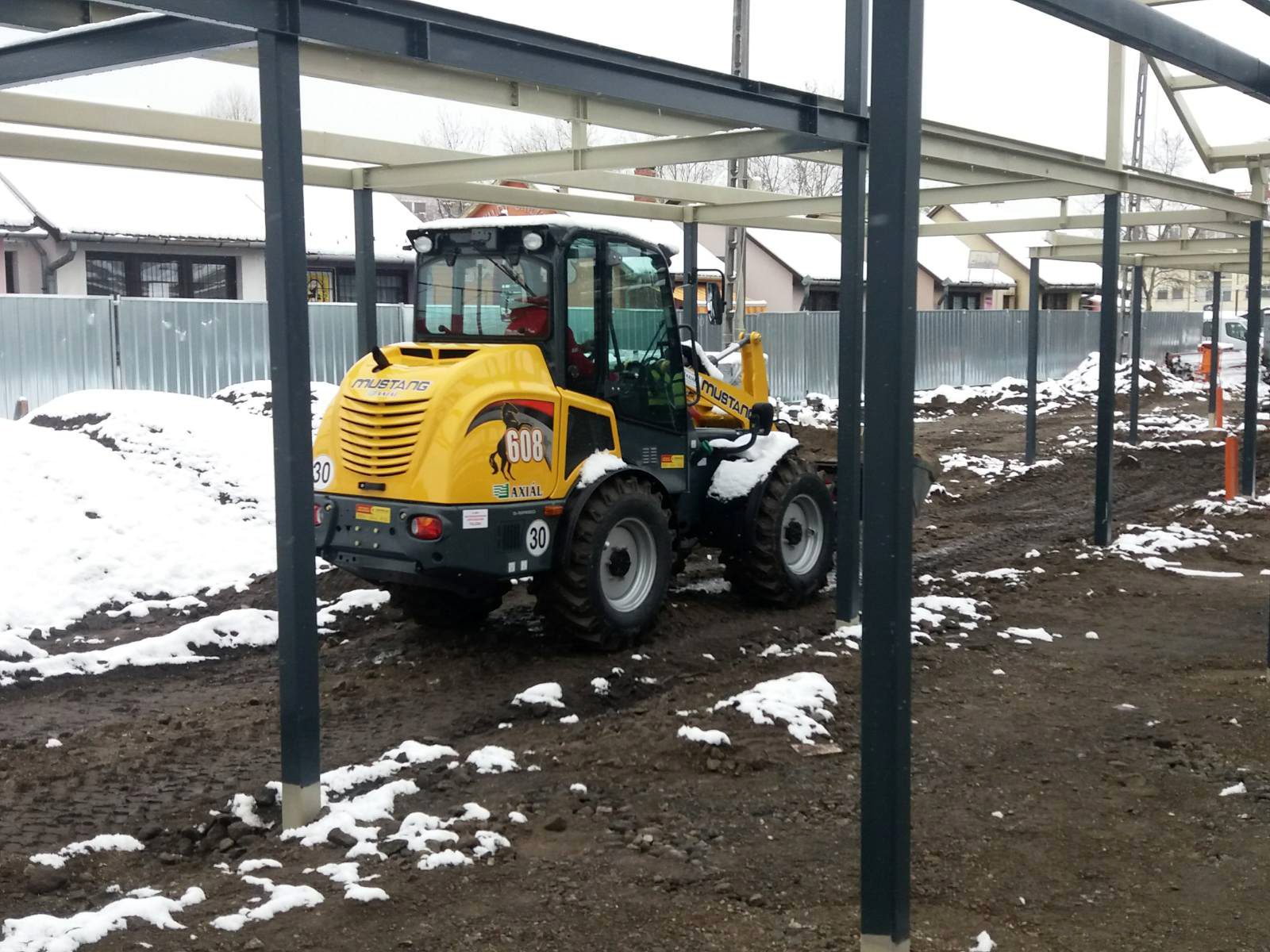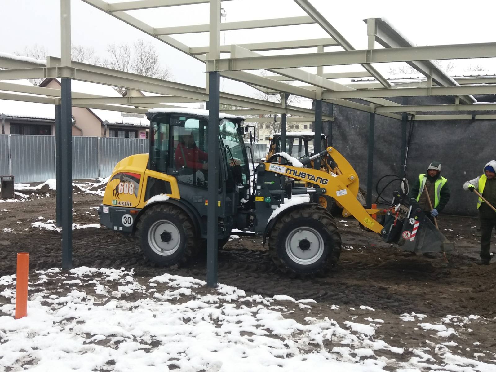 A rossz idő ellenére is folyik a munka a bajai piactéren! Új "kolléga" érkezett meg a Modinvest kft. által épített Bajai Piactér építéséhez. Ahogy legördült a szállító trailerről, már meg is kezdte munkáját az új derékban csukló homlokrakadó, amivel a piactér tereprendezési munkálataiban kap fontos szerepet! Kiváló méreteivel és tulajdonságaival és méretéhez képest nagy homlokrakodó "kanalának" köszönhetően máris nagy segítséget nyújt a ledermedt talaj tereprendezésében. Modinvest Kft. saját beszerzésében kezdte meg munkáját az új Mustang Manitou 608 derékcsuklós homlokrakodó. Bízunk benne, hogy még sok-sok munkaterületen találkozhattok vele!