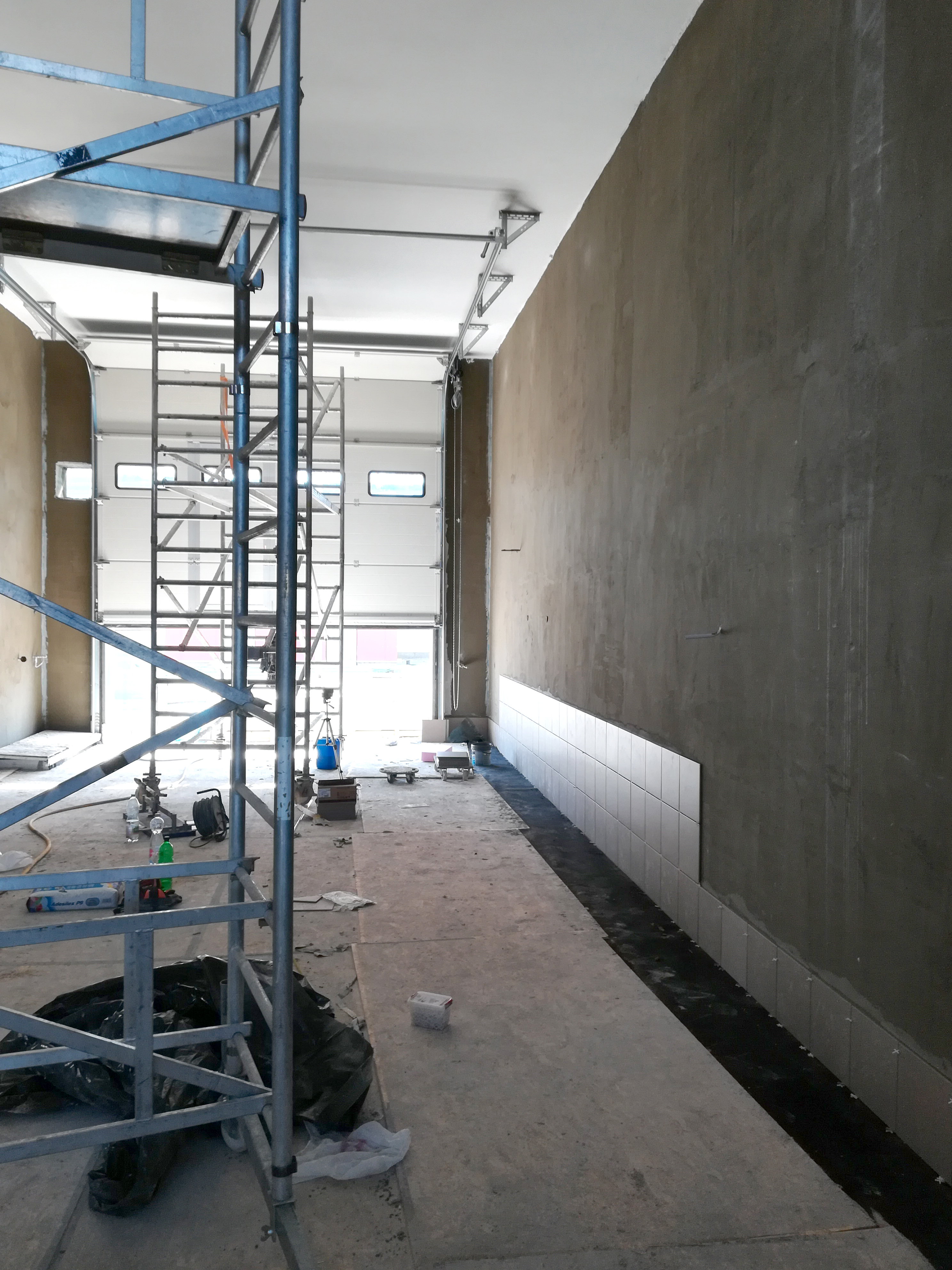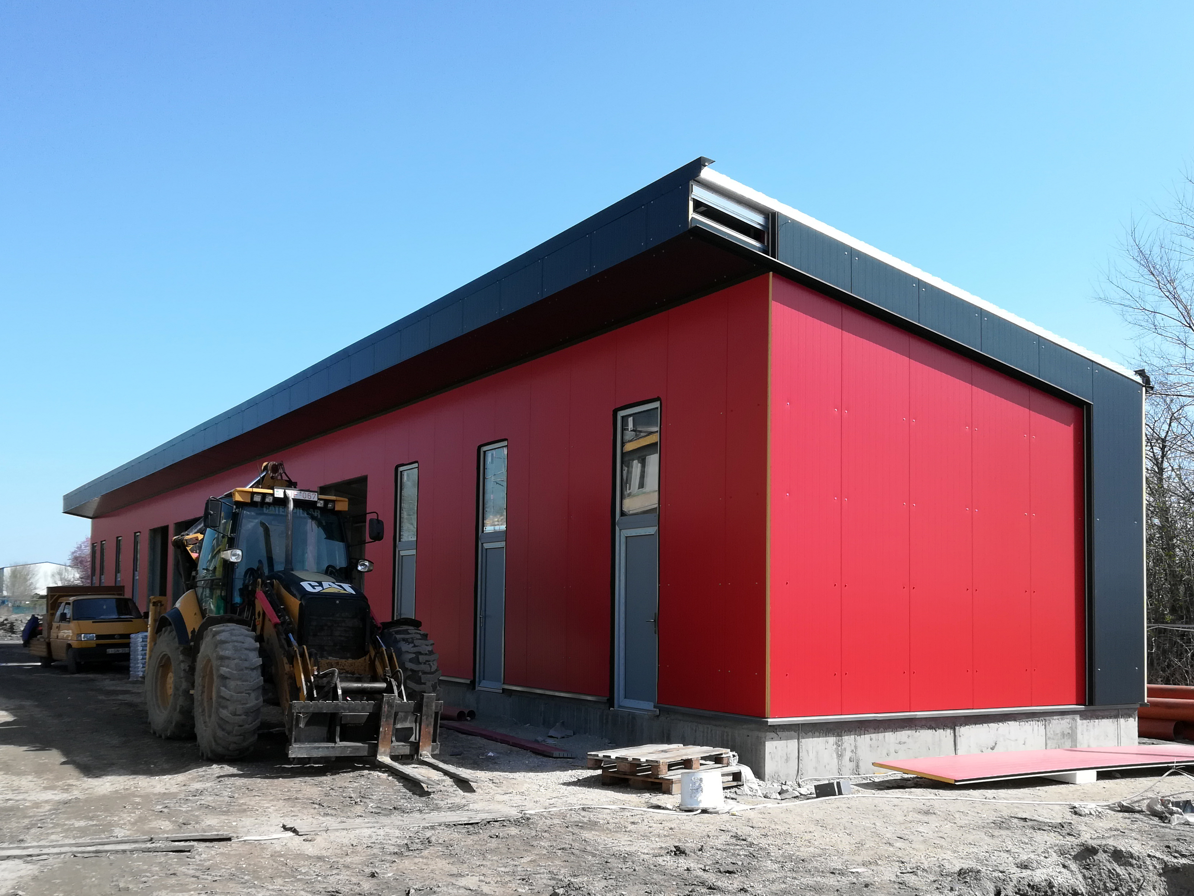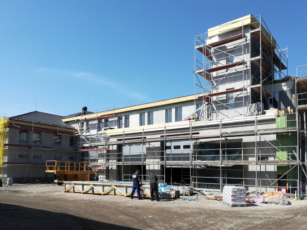 A Modinvest Kft. kivitelezésében készülő Kiskőrösi Hivatásos Tűzoltó-parancsnokság építkezés jó ütemben halad, a külső munkálatokat a hideg időre való tekintettel leállítottuk, nedves-fagyveszélyes technológiát nem alkalmazunk. A hideg idő ellenére is végezhető összeszerelési munkálatok folynak, ennek köszönhetően a raktár épület 80%os készültséget ért el. Az épületet a hideg beállta előtt sikerült zártá tenni, így a belső munkálatok folyamatosak. A végleges felületet kapott ipari beton a szerállások (tűzoltóautók) helyén elkészült, a magasban történő technológia szerelést gurulós állványról végezzük. A végleges felületű térbetont geotextilia fólia és OSB takarással védjük meg a sérülésektől. A később elbontásra kerülő ideiglenes burkolat kialakítása munkaigényes feladat volt, de szükséges megfelelő minőségű épület átadásához.