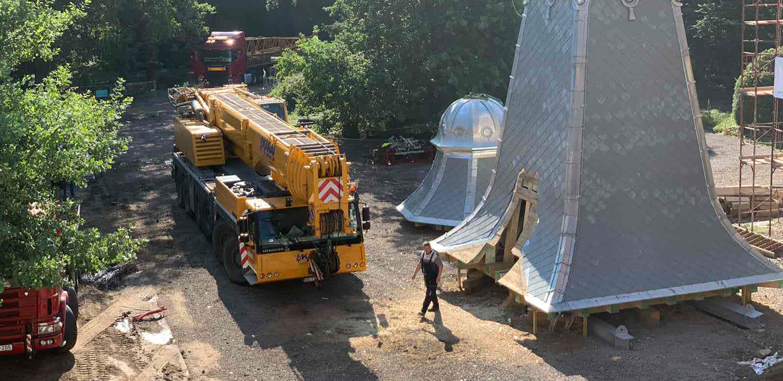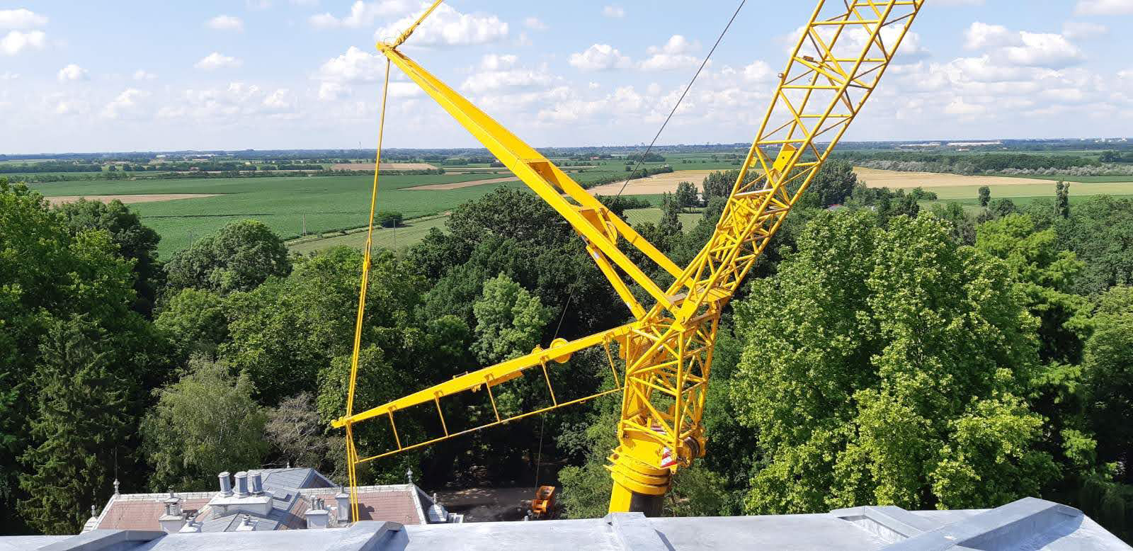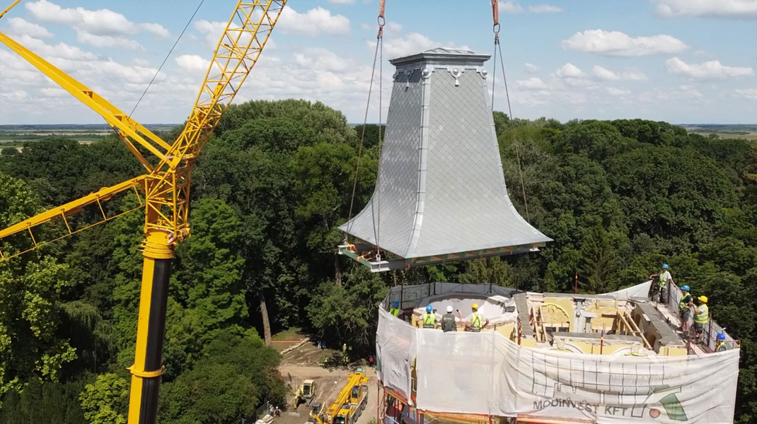 – A toronysisak emelésnél az a legnehezebb, hogy minden tényező egyszerre, egy helyen valósuljon meg. A 250 tonnás mobil daru emelőszerkezet, az időjárás, illetve nem utolsósorban a megfelelő szakemberek egyszerre történő, egymást kiegészítő munkavégzése elengedhetetlen volt a sikeres beemelési munkák során – osztotta meg a területi vezető. A kastély átadásáig a festő-, a kő-, a fém- és restaurátori munkák, valamint a homlokzati, belsőépítészeti, illetve a kert- és az útépítési munkák vannak még hátra.