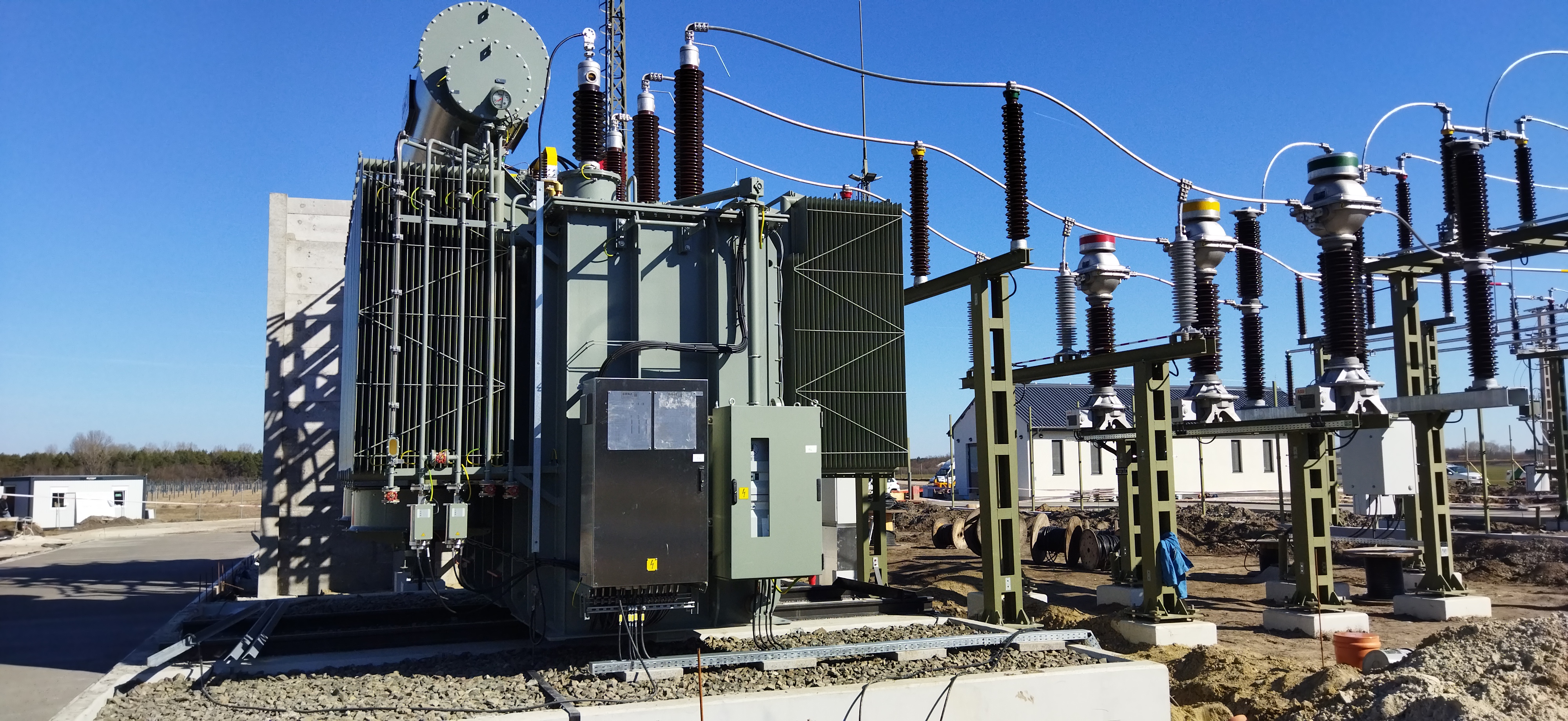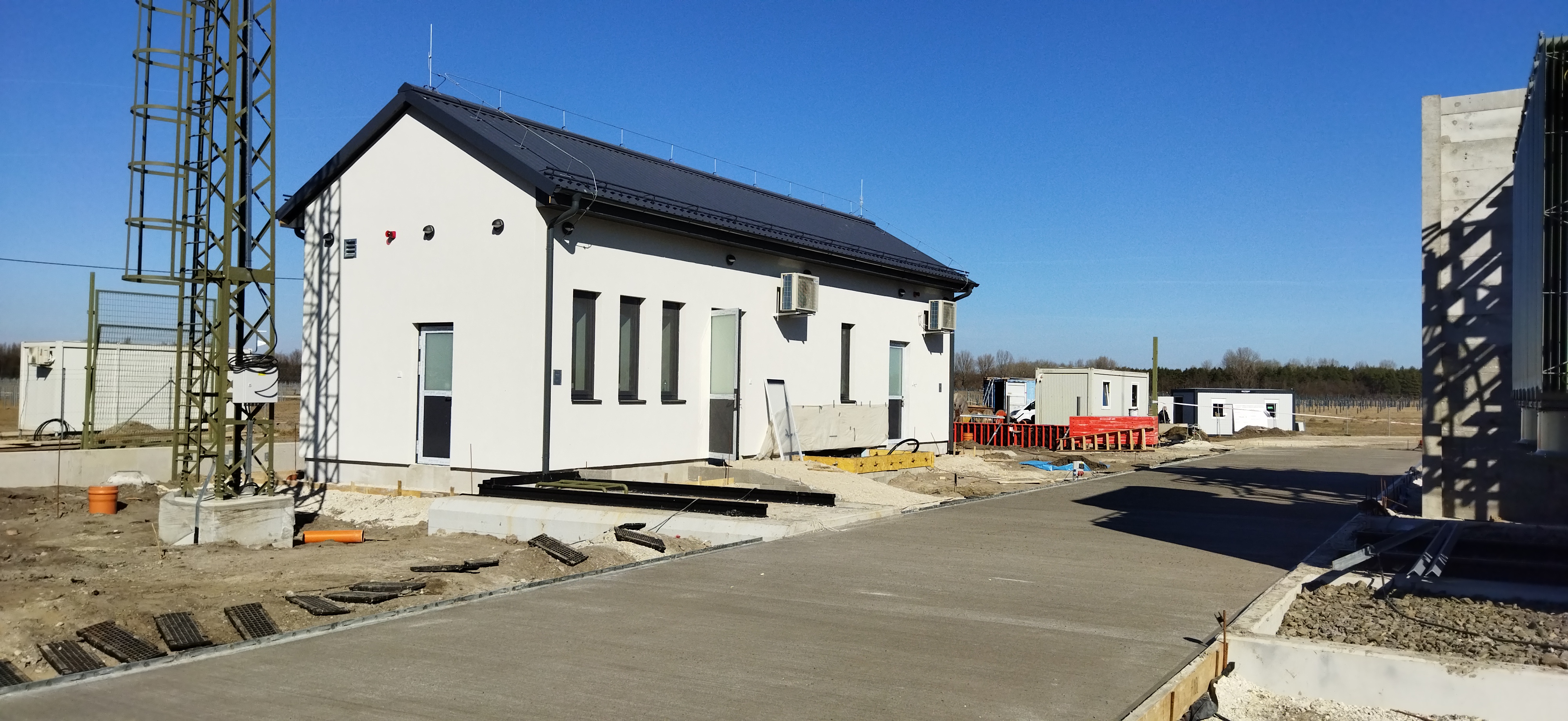 Az alállomáson 1-1 kiszolgáló épület 120 és 80 m2-es alapterülettel az épületek vízellátása az újonnan létesített fúrt kútról biztosított a keletkezett szennyvizek megfelelő tárolásáról 4 m3-es előregyártott vasbeton tartályok gondoskodnak. Az épületek technológiai és installációs szerelési munkái 95 %-osak. A megfelelő közlekedést az általunk létesített 1.400 m2 térbeton biztosítja, az üzembiztonság és az előírásoknak megfelelően egy 100 m3-es tározó kapacitású tűzivíz tározó létesítése is feladatunk. A megtermelt villamosenergia transzformálásához szükséges transzformátor alap elkészült kármentő tartállyal a hozzákapcsolódó olajfogó berendezéssel és tisztított víz átemelő aknával együtt. A szabadtéri csapadékvíz elvezetését 10 db víznyelő 80 fm folyóka és 400 fm csapadékvíz csatorna biztosítja. Az alállomás területének lehatárolását 380 fm egyedi gyártású, beton lábazatos kerítés biztosítja.