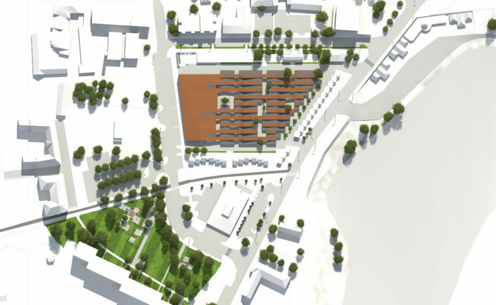 A meglévő vásárcsarnok és a keleti telekhatáron álló irodaépület, valamint hozzávetőlegesen 3200 m2 beton térburkolat elbontásra kerül.